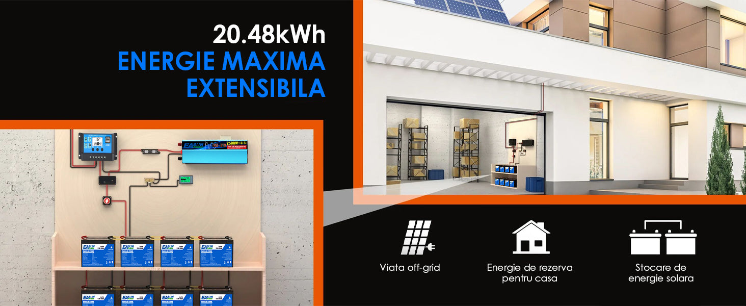 Prin conectarea a până la 16 baterii Easunpower de 12V 100Ah grupa 24 într-o configurație 4P4S, sistemul rezultat de 51,2V 400Ah deblochează o rezervă masivă de energie de 20,48 kWh. Alimentați-vă lumea fără limite datorită bateriilor din grupa 24 și dezlănțuiți întregul potențial al energiei regenerabile. O puteți adapta pentru a se potrivi caselor, navelor, campingului, rulotelor, mașinilor de tuns iarba, locațiilor izolate de rețea - oriunde sunt esențiale durate extinse de funcționare.