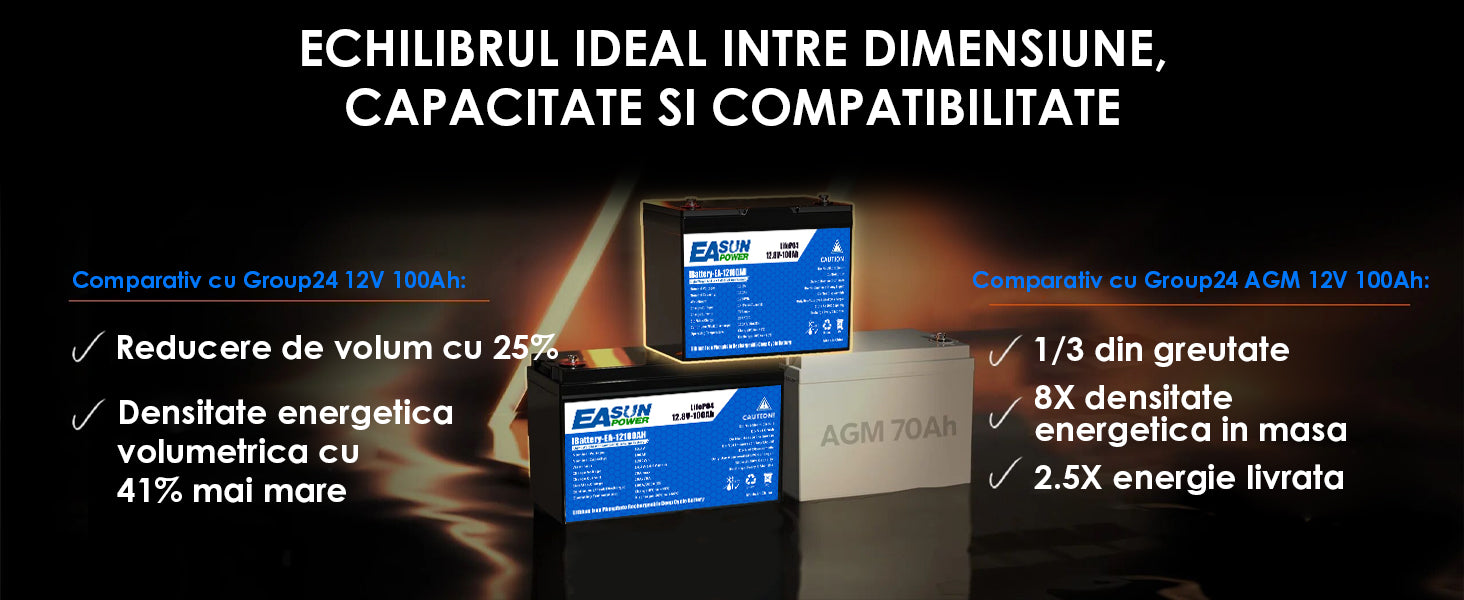 Bateria de litiu Easunpower de 12V 100Ah grupa 24 are cu 41% mai multă VED (Densitate Energetică Volumetrică), dar doar cu 75% din volumul bateriei de 12V 100Ah Grupa 31. De asemenea, este cu 1/3 mai ușoară decât o baterie AGM Group24, are o densitate energetică de masă (MAD) de 8X și produce 100% energie (1280Wh). (Bateria AGM Group24 standard, cu o DOD de 50%, are o capacitate de doar 70Ah și o putere utilizabilă de 420Wh; bateria plumb-acid Group24 eliberează doar 50% energie la 100% DOD)