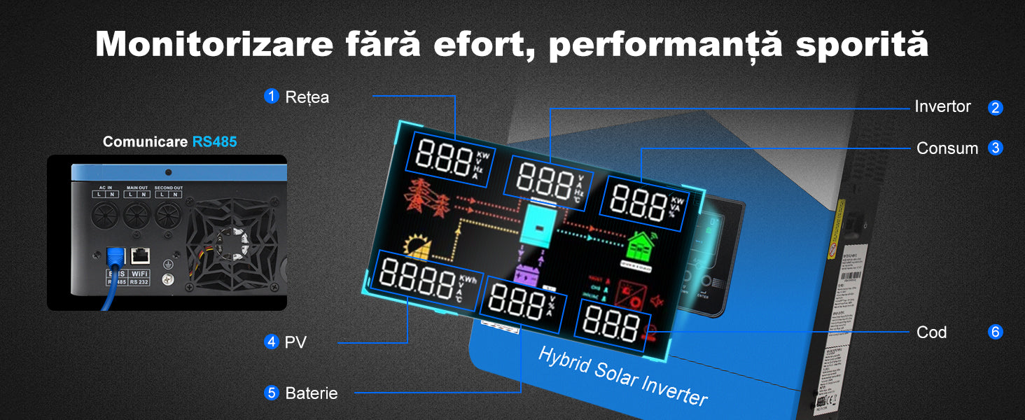 Păstrați controlul cu ajutorul afișajului LCD încorporat și al comunicării RS485. Monitorizați datele sistemului, primiți alerte de eroare și urmăriți performanța intrărilor/ieșirilor — totul în timp real. Optimizați cu ușurință consumul de energie și starea bateriei cu o vizibilitate precisă a sistemului.