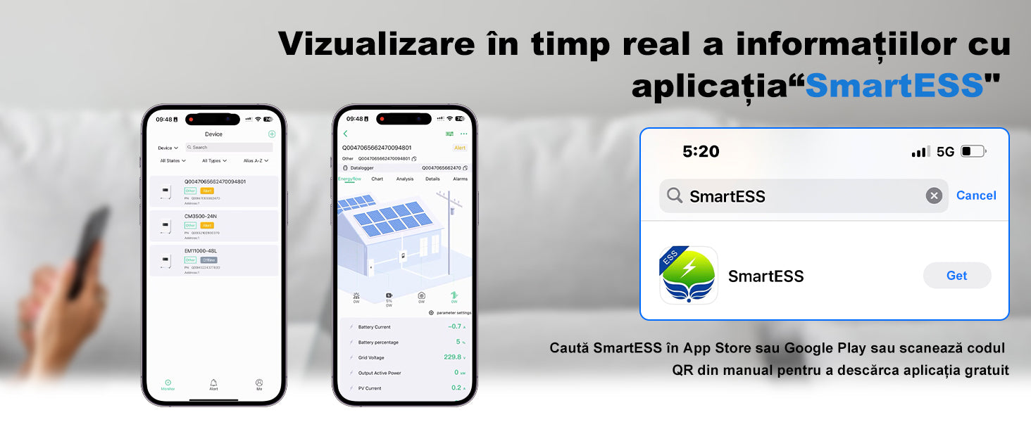 Vizualizați informații despre baterie în timp real folosind aplicația „SmartESS”. Pur și simplu căutați „SmartESS” în App Store sau Google Play sau scanați codul QR din manual pentru a descărca aplicația gratuit. Acest lucru vă permite să monitorizați și să gestionați convenabil performanța invertorului direct de pe smartphone sau tabletă.