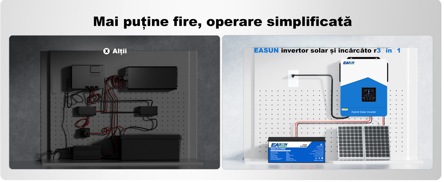 Spuneți adio cablajului dezordonat și componentelor împrăștiate! Încărcătorul solar cu invertor EASUN POWER integrează MPPT, invertorul și încărcătorul într-o unitate compactă — economisind spațiu de instalare, simplificând cablarea și făcând sistemul energetic al locuinței mai curat, mai sigur și mai ușor de gestionat.