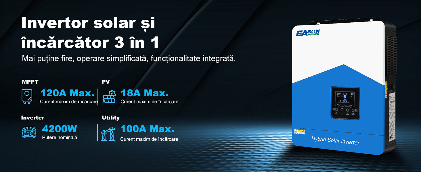 Invertorul solar EASUN 48V 4200W integrează alimentarea solară, alimentarea rețelei și capacitățile de încărcare a bateriei - oferind încărcare fără întreruperi, putere de ieșire stabilă și alimentare de rezervă fiabilă. Creează cu ușurință un sistem energetic complet și profesional pentru locuințe.