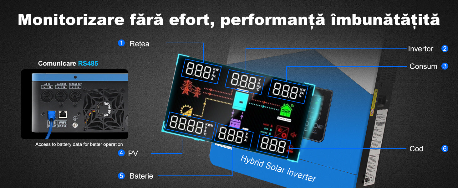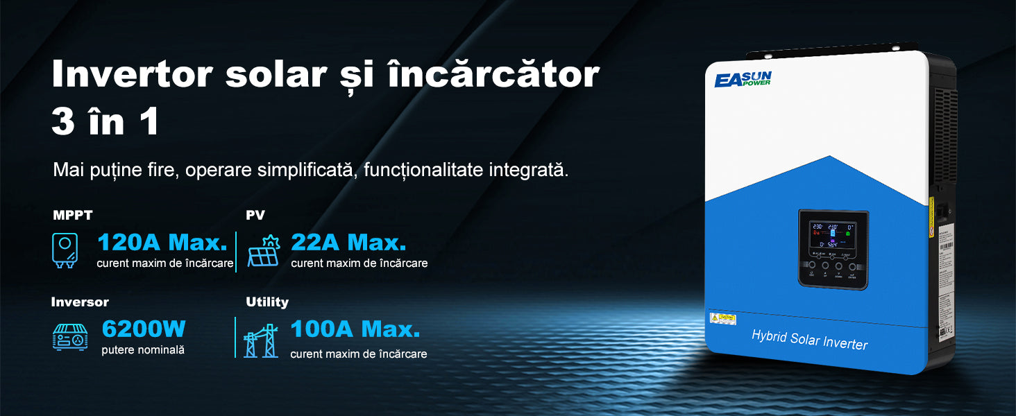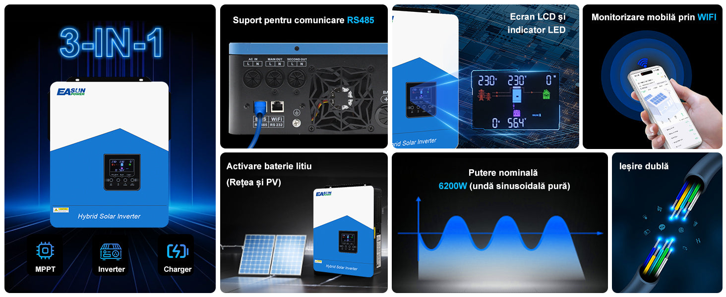 De la designul său all-in-one, puterea nominală de 6200W și puterea de vârf de până la 6500W, la afișajul LCD clar, monitorizarea mobilă WiFi și suportul pentru comunicarea RS485 - invertorul solar și încărcătorul de baterii EASUN POWER 48V 6200W oferă o soluție eficientă, inteligentă și stabilă de gestionare a energiei pentru fiecare nevoie de energie a locuinței.