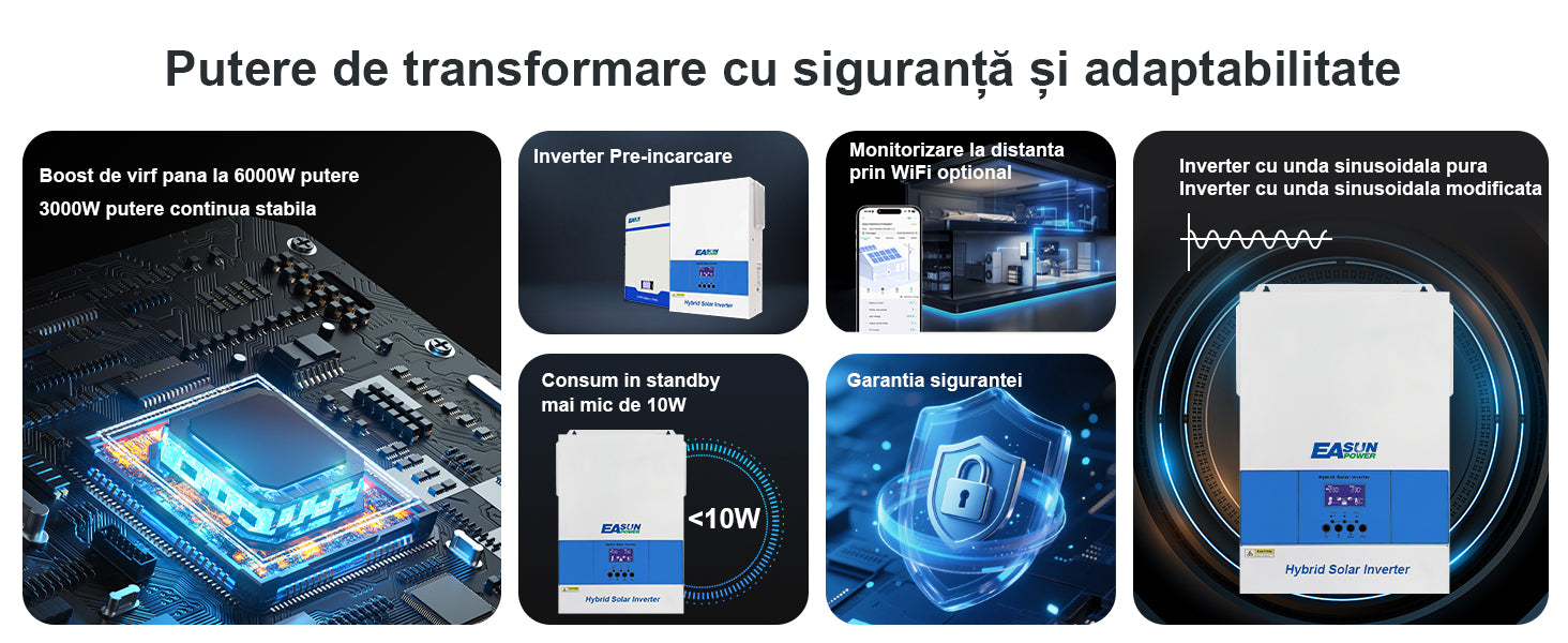 Invertor 6200W: Invertorul Easun Power de 6200W cu undă sinusoidală pură convertește eficient 48V DC în 220V-230V AC. Oferă o ieșire de curent curată, stabilă și cu interferențe reduse pentru toate aparatele, asigurând funcționarea lor stabilă pe termen lung.