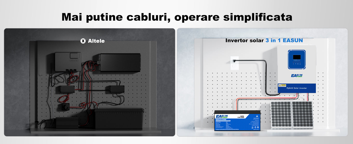 Spune adio cablajului dezordonat și componentelor împrăștiate! Încărcătorul invertorului solar EASUN POWER integrează MPPT, invertorul și încărcătorul într-o unitate compactă - economisind spațiu de instalare, simplificând cablarea și făcând sistemul energetic al locuinței mai curat, mai sigur și mai ușor de gestionat.