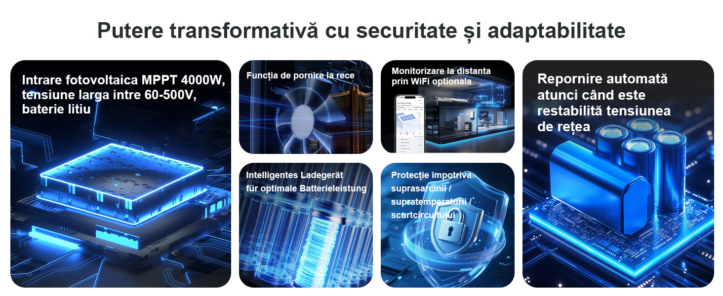 Această soluție energetică extrem de eficientă și stabilă este concepută atât pentru aplicații casnice, cât și comerciale. Utilizează tehnologie avansată de ieșire cu undă sinusoidală pură pentru a asigura un curent de ieșire lin și pur, protejând aparatele dumneavoastră delicate. Un controler de încărcare solară de înaltă performanță încorporat ajustează inteligent eficiența încărcării și descărcării, prelungind eficient durata de viață a bateriei.