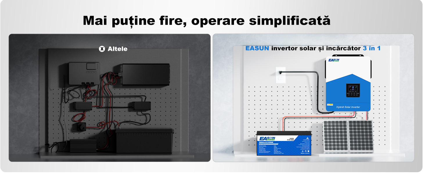 Spuneți adio cablajului dezordonat și componentelor împrăștiate! Încărcătorul solar cu invertor EASUN POWER integrează MPPT, invertorul și încărcătorul într-o unitate compactă — economisind spațiu de instalare, simplificând cablarea și făcând sistemul energetic al locuinței mai curat, mai sigur și mai ușor de gestionat.