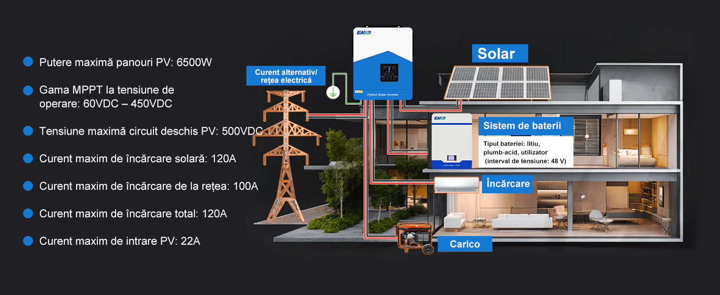 De la designul său all-in-one, puterea nominală de 6200W și puterea de vârf de până la 6500W, la afișajul LCD clar, monitorizarea mobilă WiFi și suportul pentru comunicarea RS485 - invertorul solar și încărcătorul de baterii EASUN POWER 48V 6200W oferă o soluție eficientă, inteligentă și stabilă de gestionare a energiei pentru fiecare nevoie de energie a locuinței.